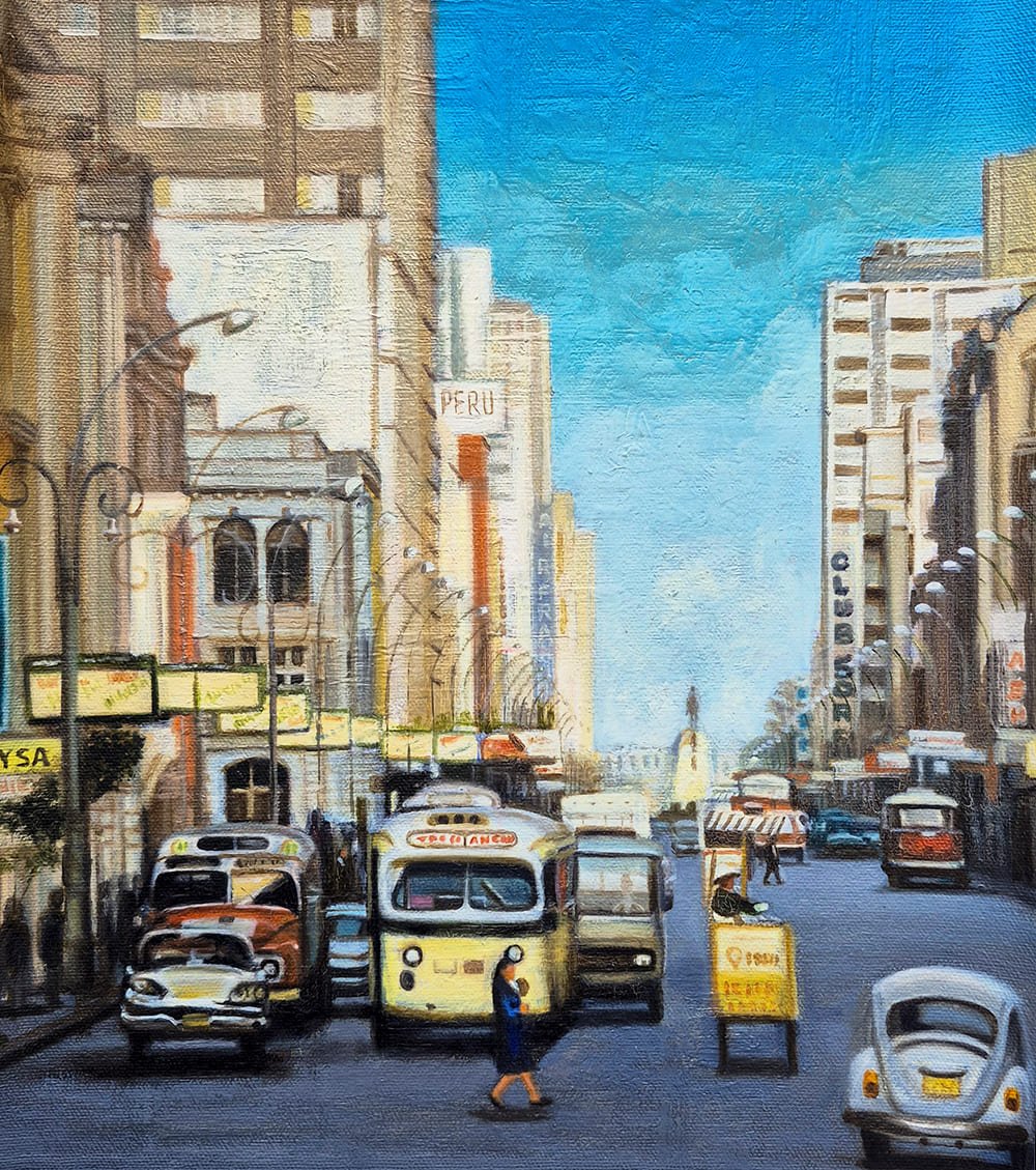 Esta pintura urbana de Lima está inspirada en la emblemática Avenida Nicolás de Piérola, conocida popularmente como “La Colmena”, un espacio clave en la modernización de la ciudad a inicios del siglo XX. La obra captura el dinamismo del centro histórico, con su arquitectura, transporte tradicional y vida cotidiana que reflejan la esencia limeña.