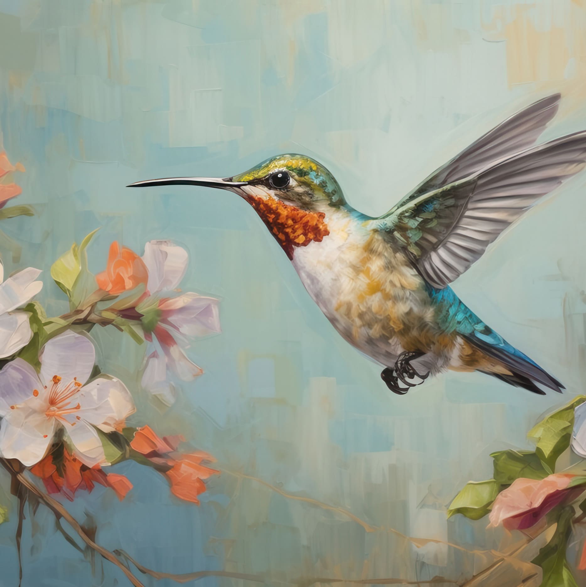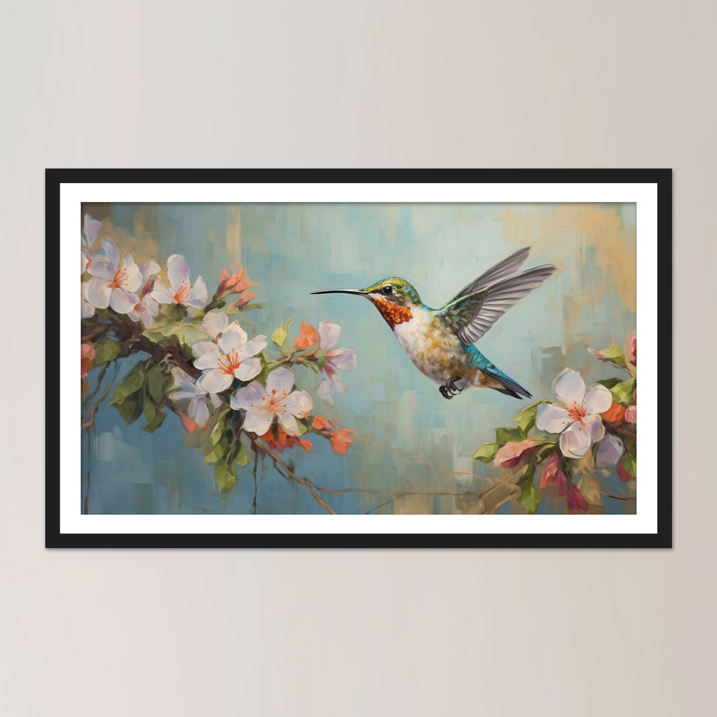 Este cuadro decorativo captura la elegancia y el dinamismo del colibrí en vuelo, rodeado de hermosas flores. Realizado en óleo sobre lienzo, esta obra de arte destaca por su vibrante paleta de colores y el detallado realismo de la escena. El fondo suave y cálido resalta la figura del colibrí, creando un contraste que atrae todas las miradas.