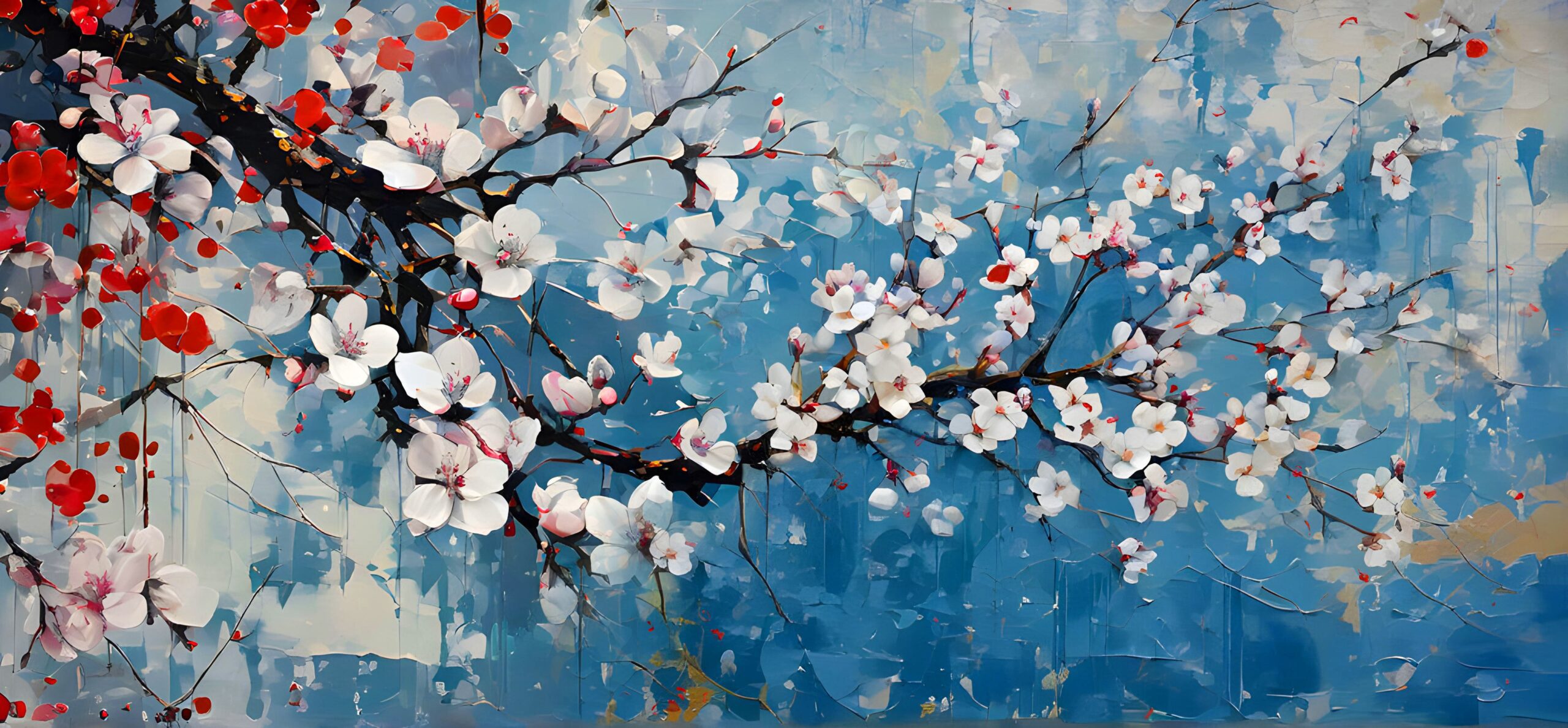 Este cuadro decorativo moderno en óleo sobre lienzo representa ramas de flor de cerezo en estilo abstracto floral, ideal para salas elegantes, comedores y espacios contemporáneos. Su composición en tonos azules y blancos lo convierte en una pieza de arte moderno para decoración de interiores, perfecta para quienes buscan cuadros modernos para sala, cuadros grandes decorativos o pintura en óleo artística para el hogar.