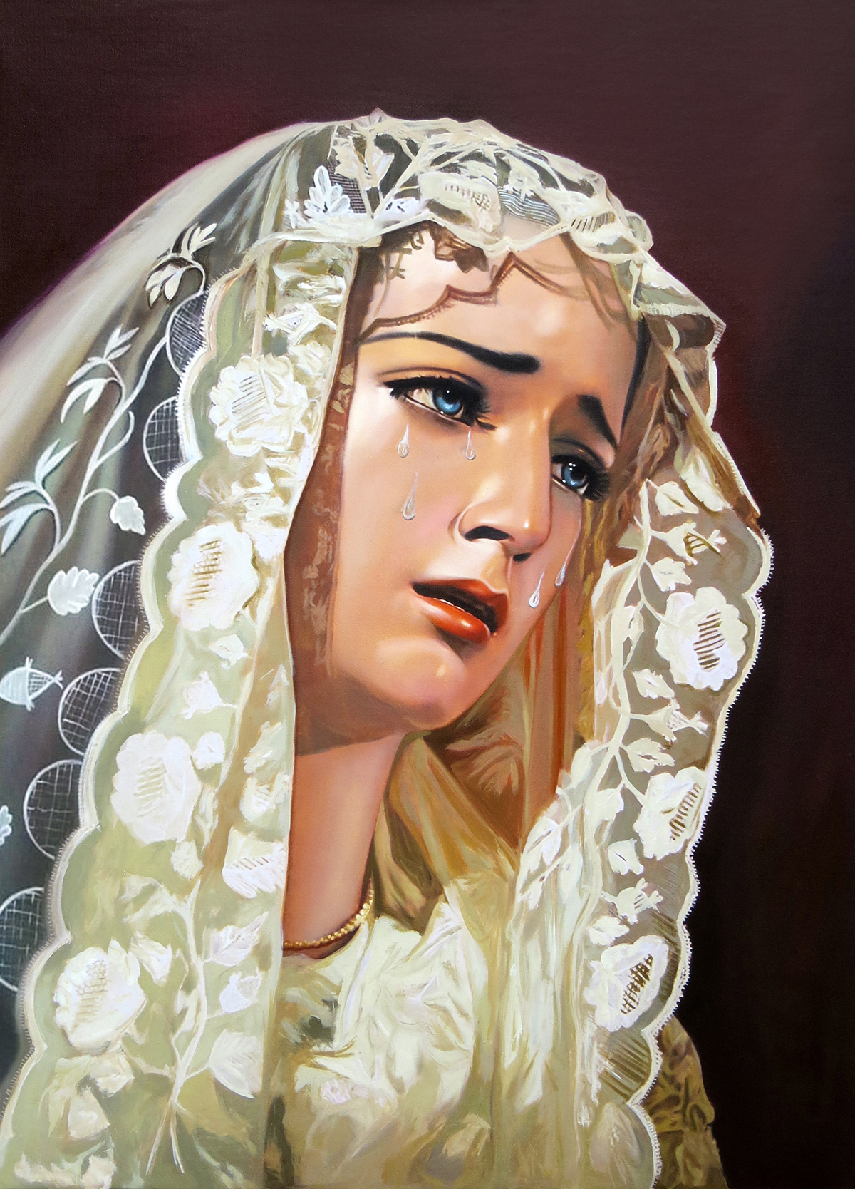Este cuadro de La Virgen Dolorosa, o Nuestra Señora de los Dolores es una obra original realizada en óleo sobre lienzo por Sedamanos Art, creada por encargo especial para una hermandad en Surco (Lima, Perú) con motivo de Semana Santa.